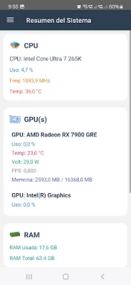 • Monitoreo de CPU: Verifica la carga (uso en %) y la temperatura de tu CPU; identifica la marca (Intel, AMD) automáticamente.